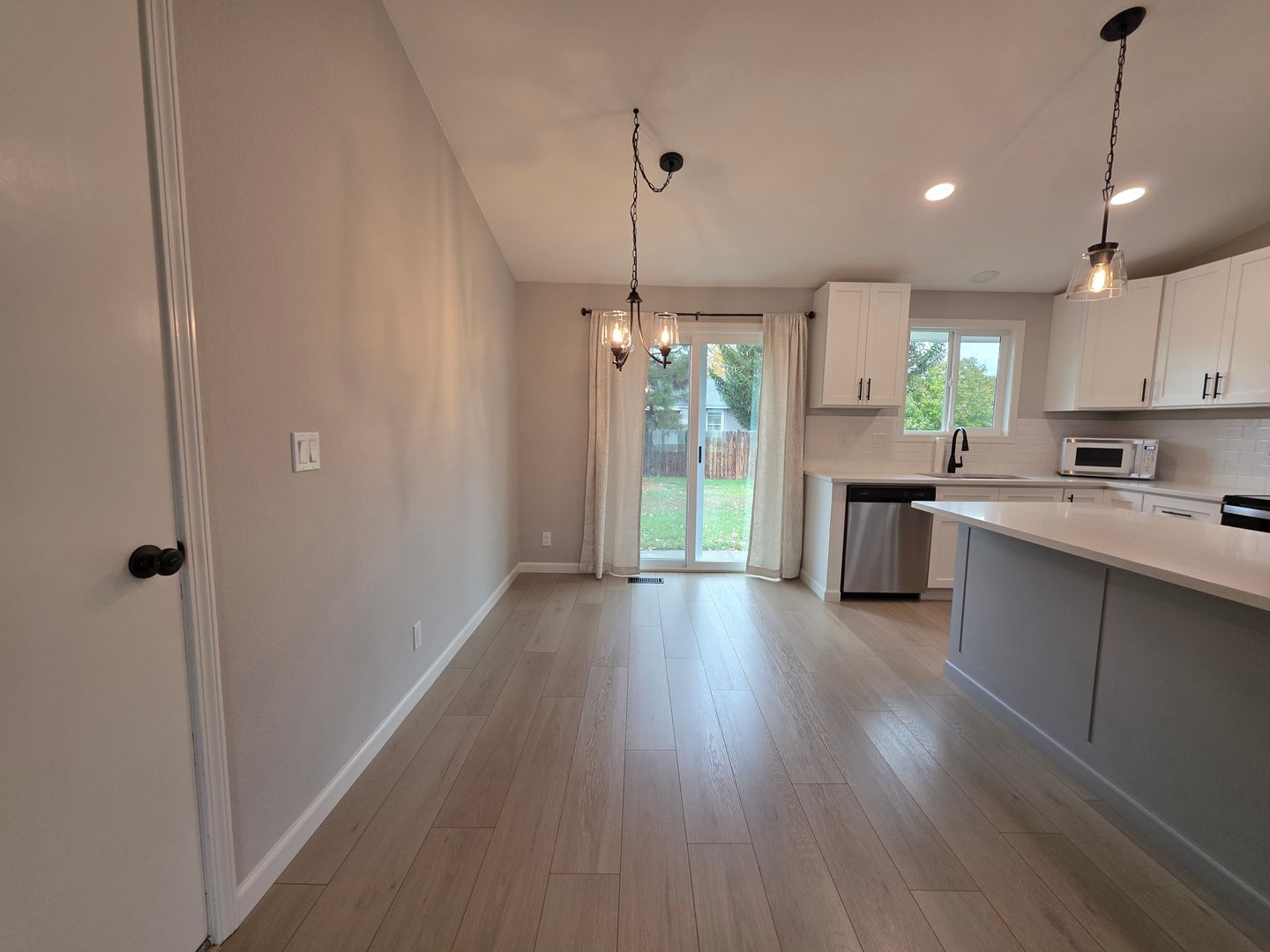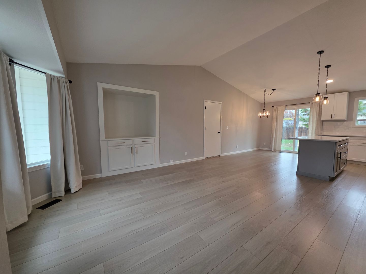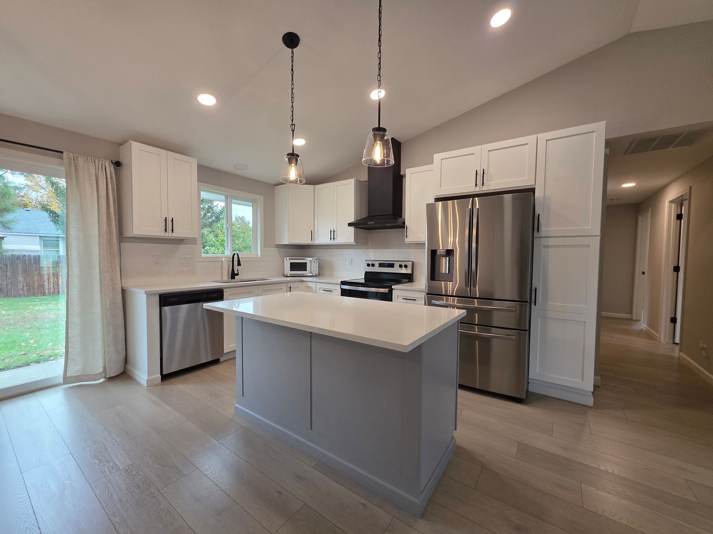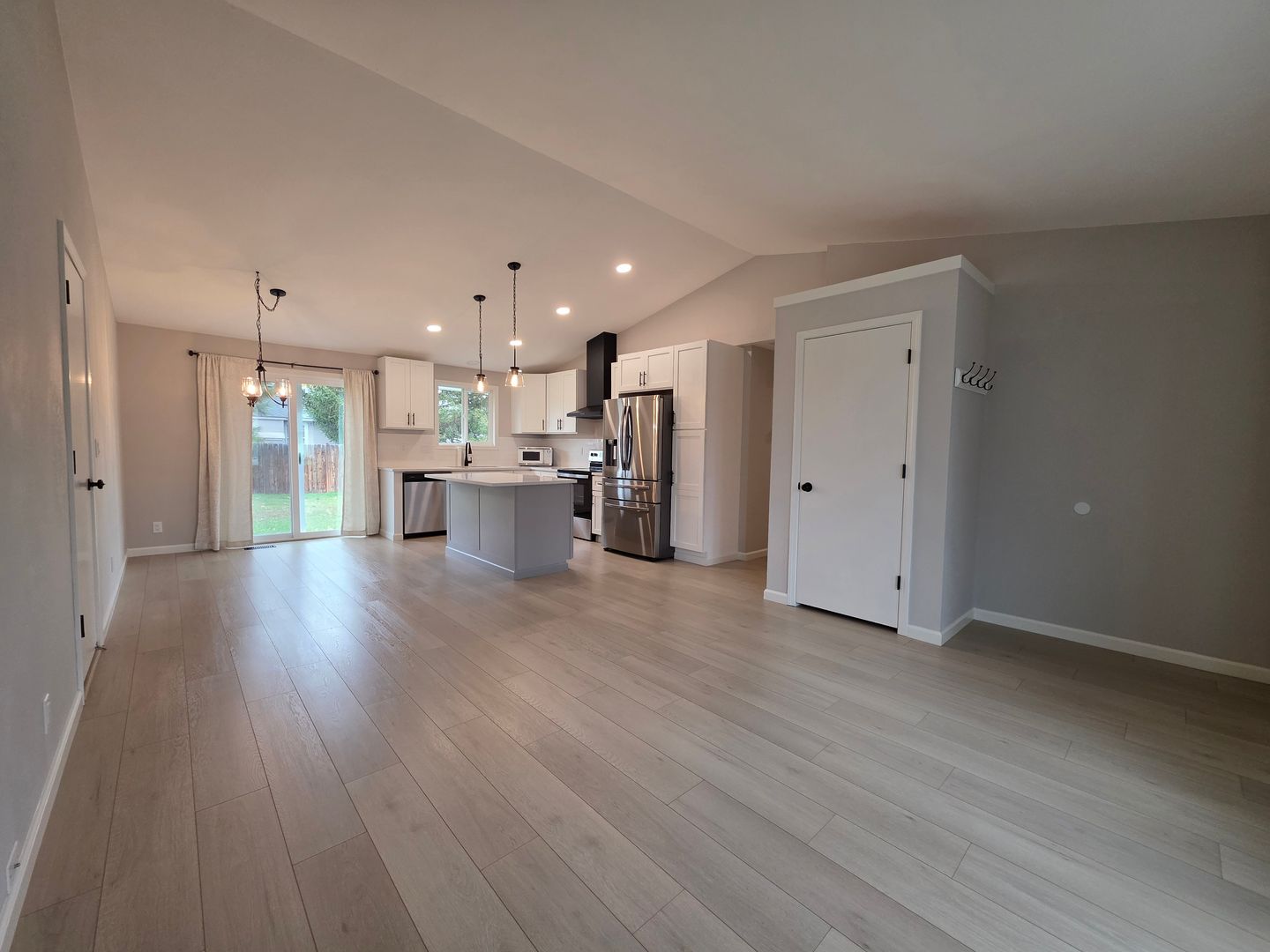 Step inside to an open floor plan with vaulted ceilings and large new windows that fill the home with natural light. The brand-new kitchen features updated cabinetry, countertops, and modern appliances, including a refrigerator, dishwasher, microwave, garbage disposal, and range/oven. Beautiful hard-surface flooring flows throughout the main living spaces, adding warmth while making cleaning and upkeep simple.