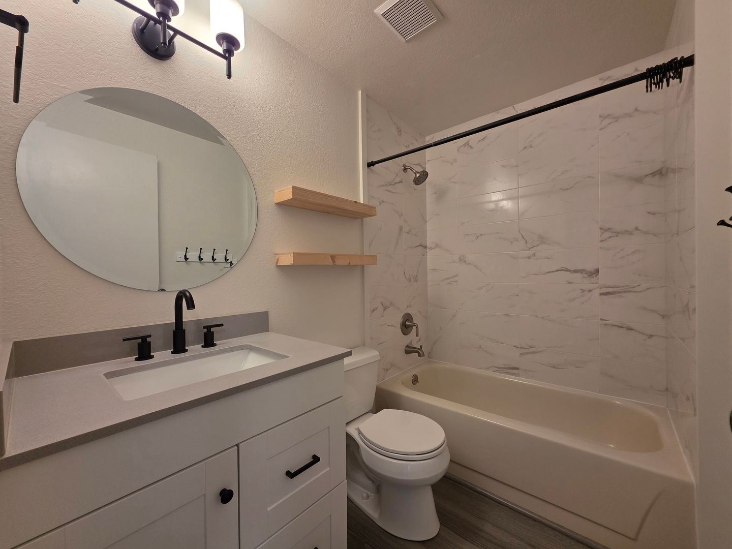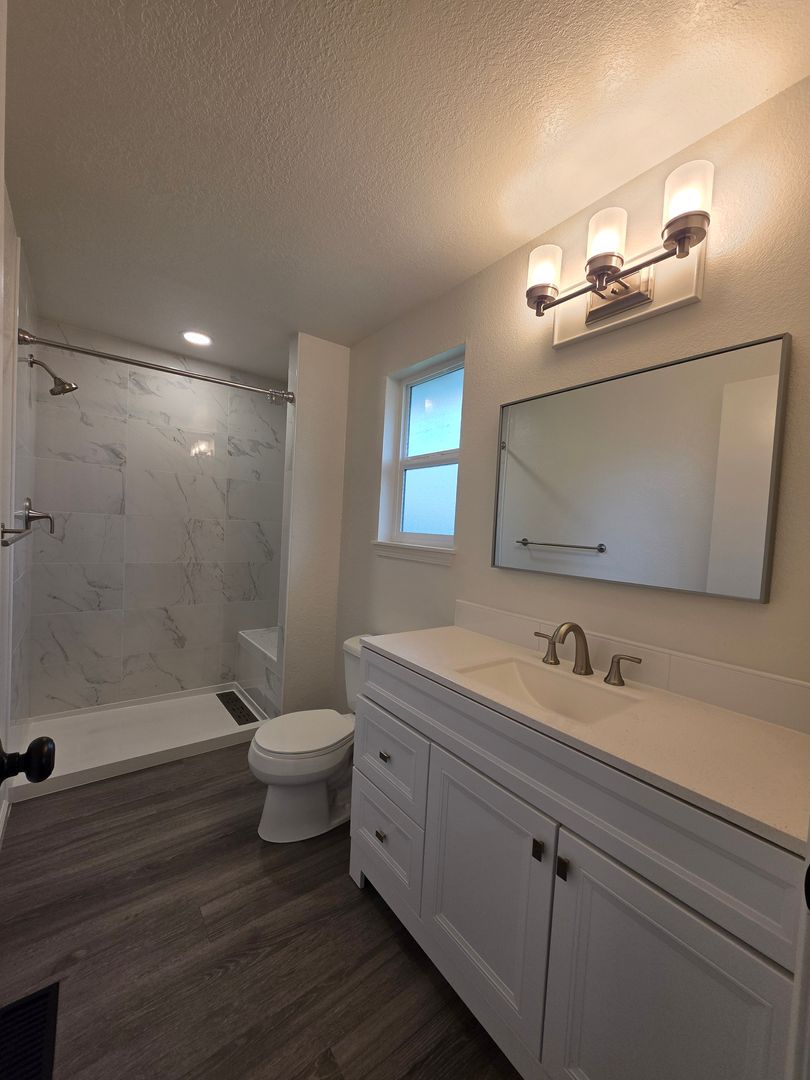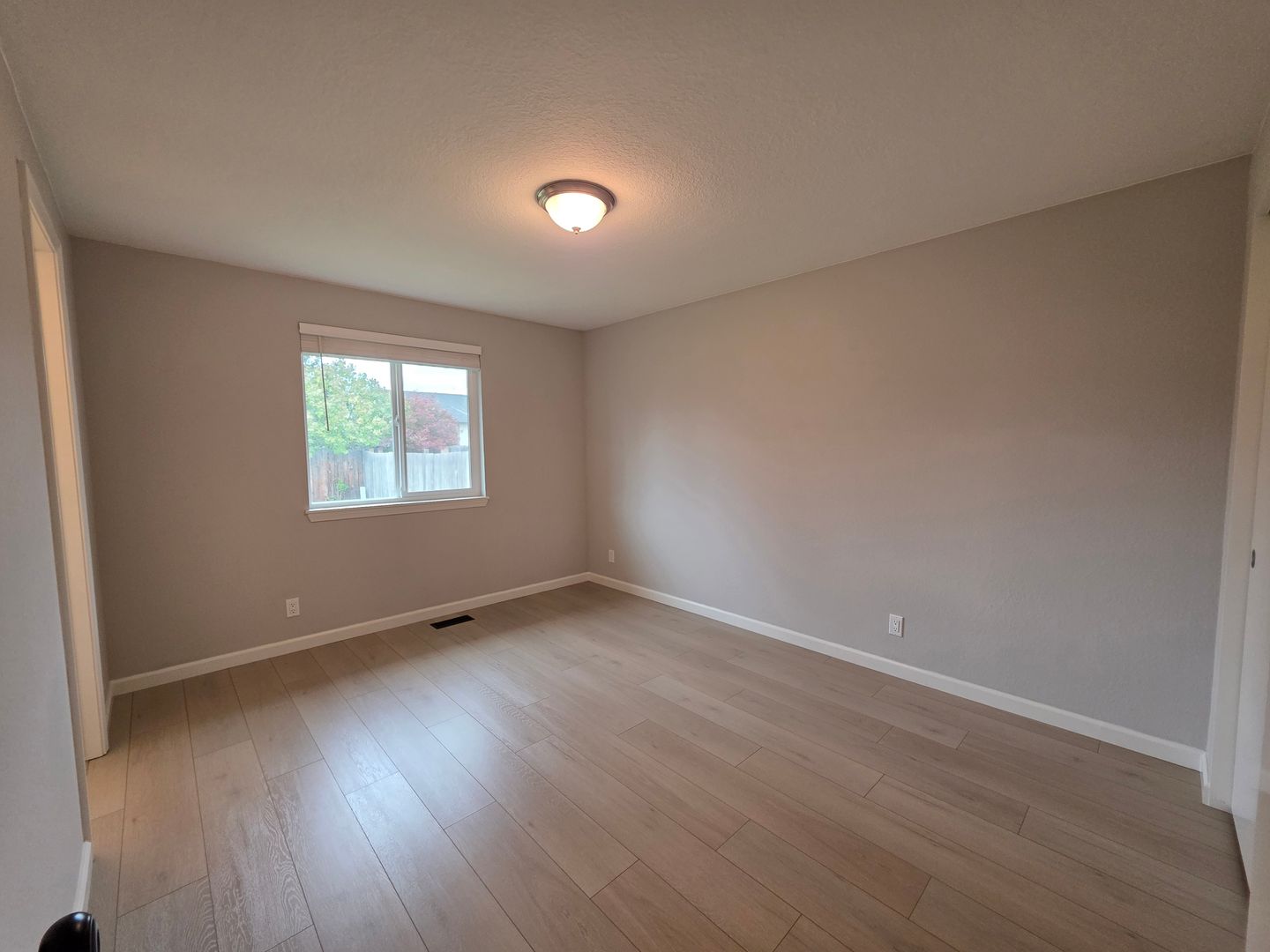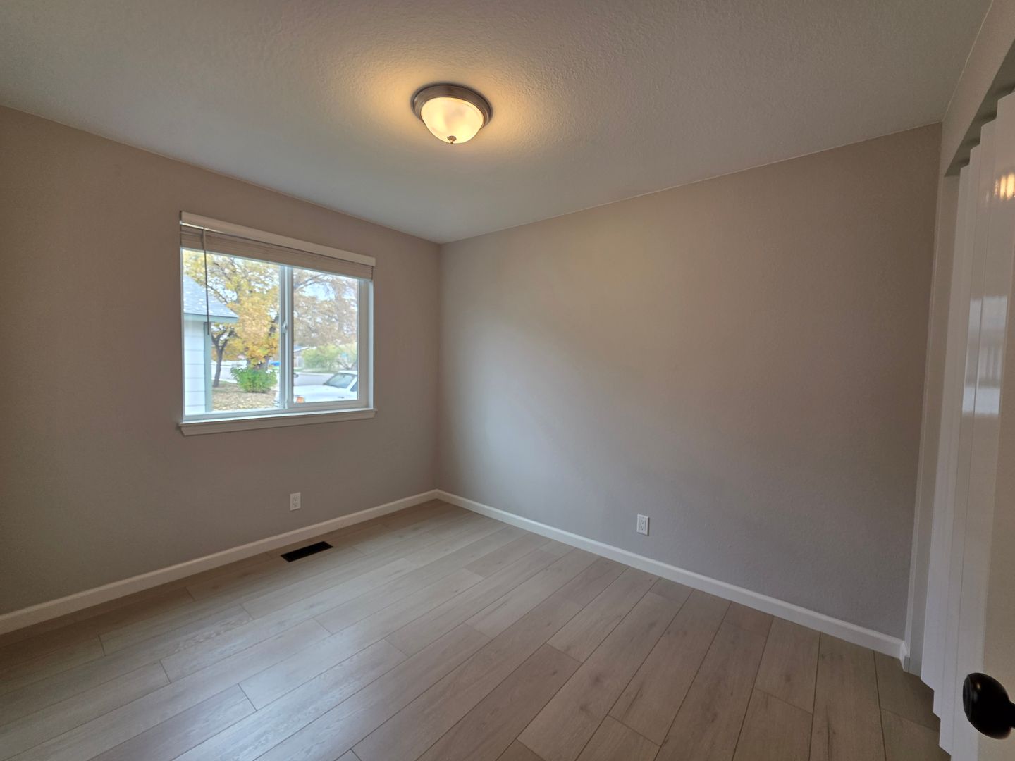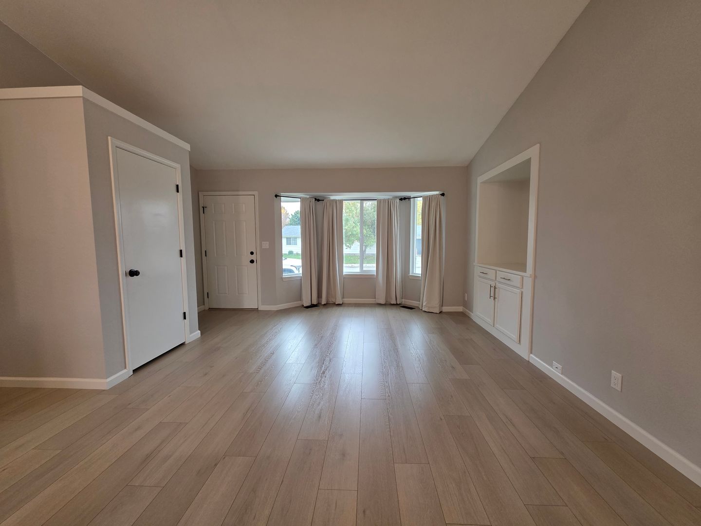 Step inside to an open floor plan with vaulted ceilings and large new windows that fill the home with natural light. The brand-new kitchen features updated cabinetry, countertops, and modern appliances, including a refrigerator, dishwasher, microwave, garbage disposal, and range/oven. Beautiful hard-surface flooring flows throughout the main living spaces, adding warmth while making cleaning and upkeep simple.