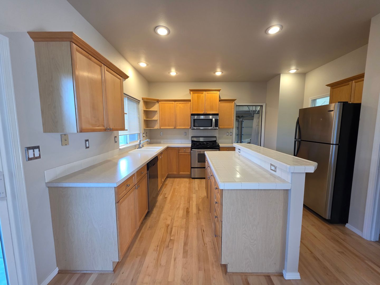 Inside, you’ll find two separate living areas plus an additional family room, providing plenty of flexibility for entertaining, work, or leisure. The main living space is open-concept, flowing from the kitchen to the dining area and living room, all enhanced by high vaulted ceilings and abundant natural light. The kitchen is equipped with stainless steel appliances, a center island, and ample cabinetry, while one of the bedrooms includes a built-in desk ideal for remote work or study.